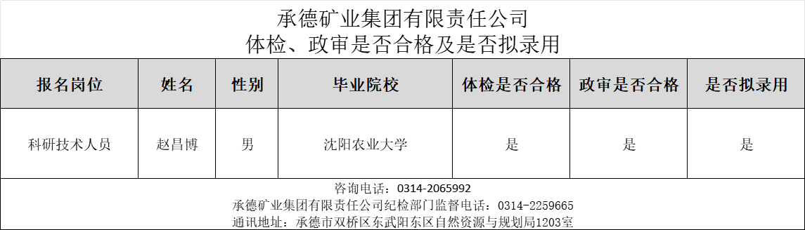 公示:承德礦業(yè)集團有限責(zé)任公司體檢、政審是否合格及是否擬錄用